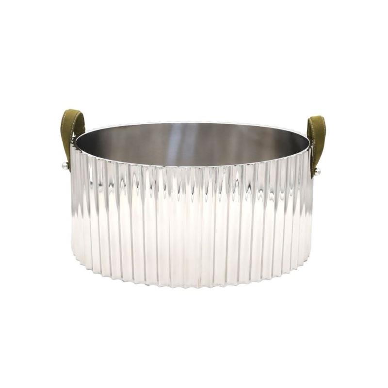 Large, double walled, with leather handles, stainless steel